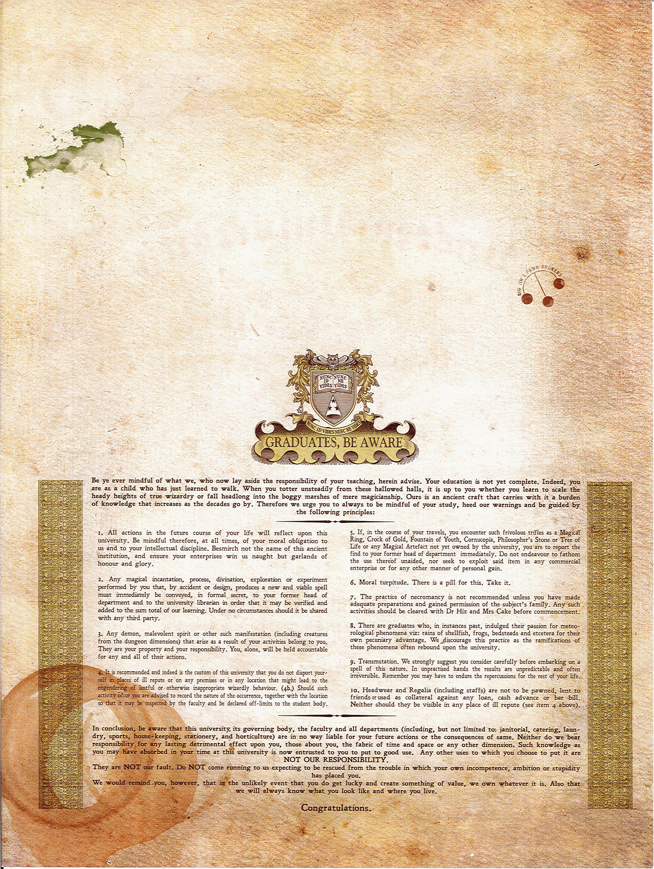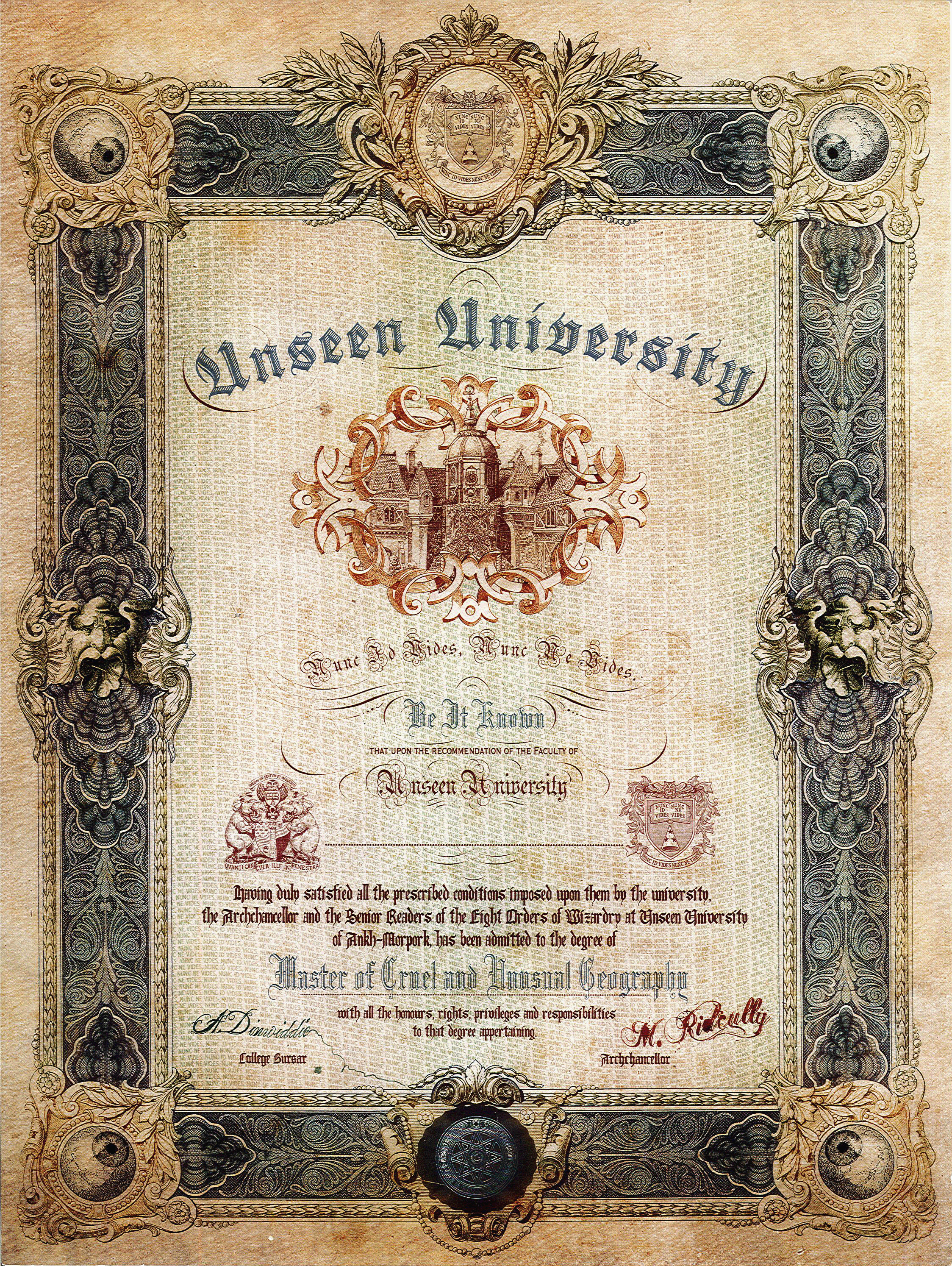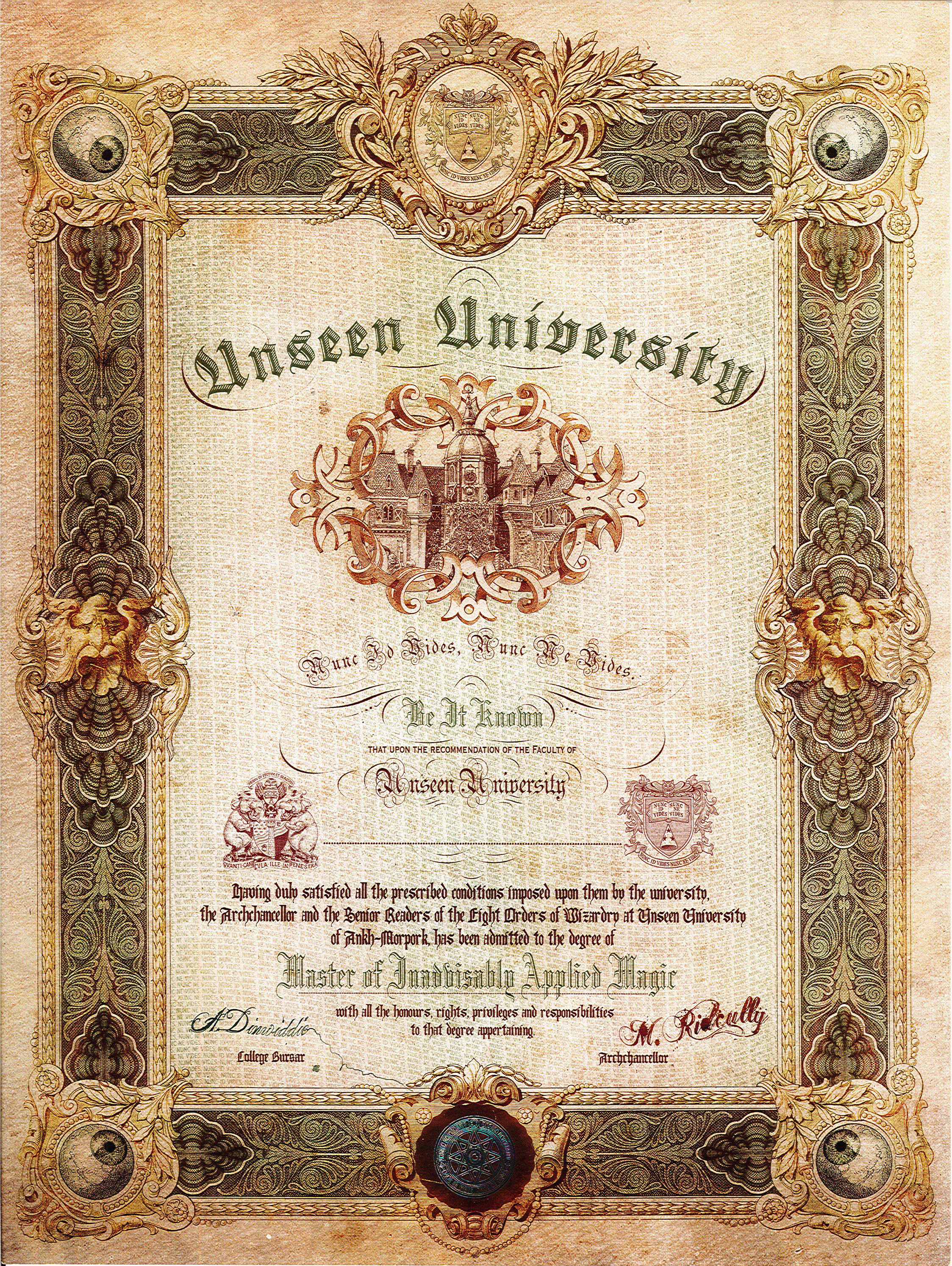 Having duly satisfied all the prescribed conditions imposed upon them by the university, the Archchancellor and the Senior Readers of the Eight Orders of Wizardry at Unseen University of Ankh-Morpork, has been admitted to the degree of