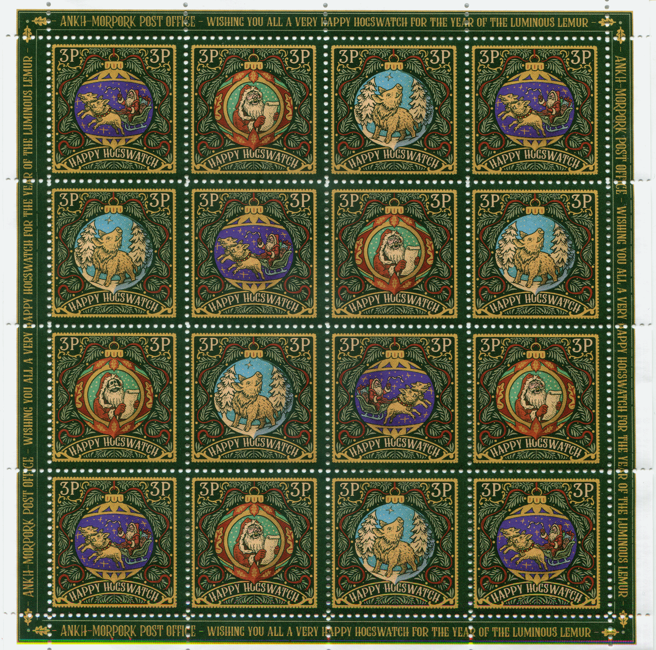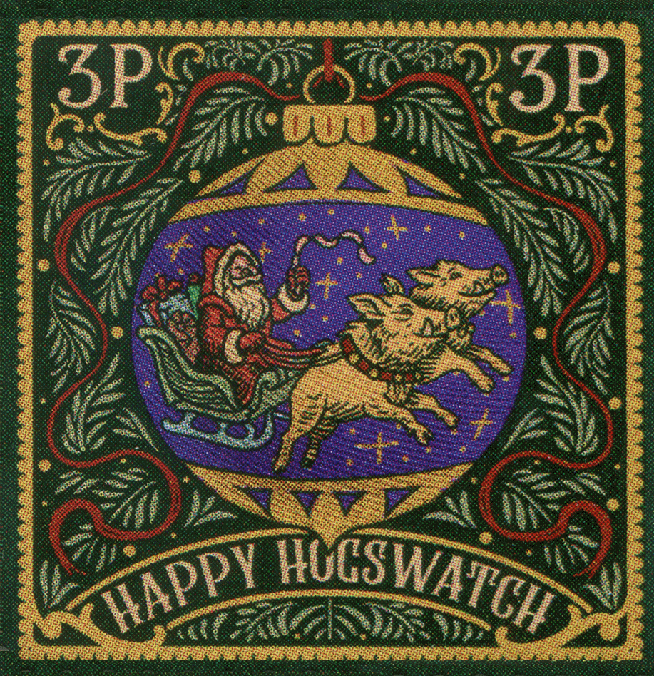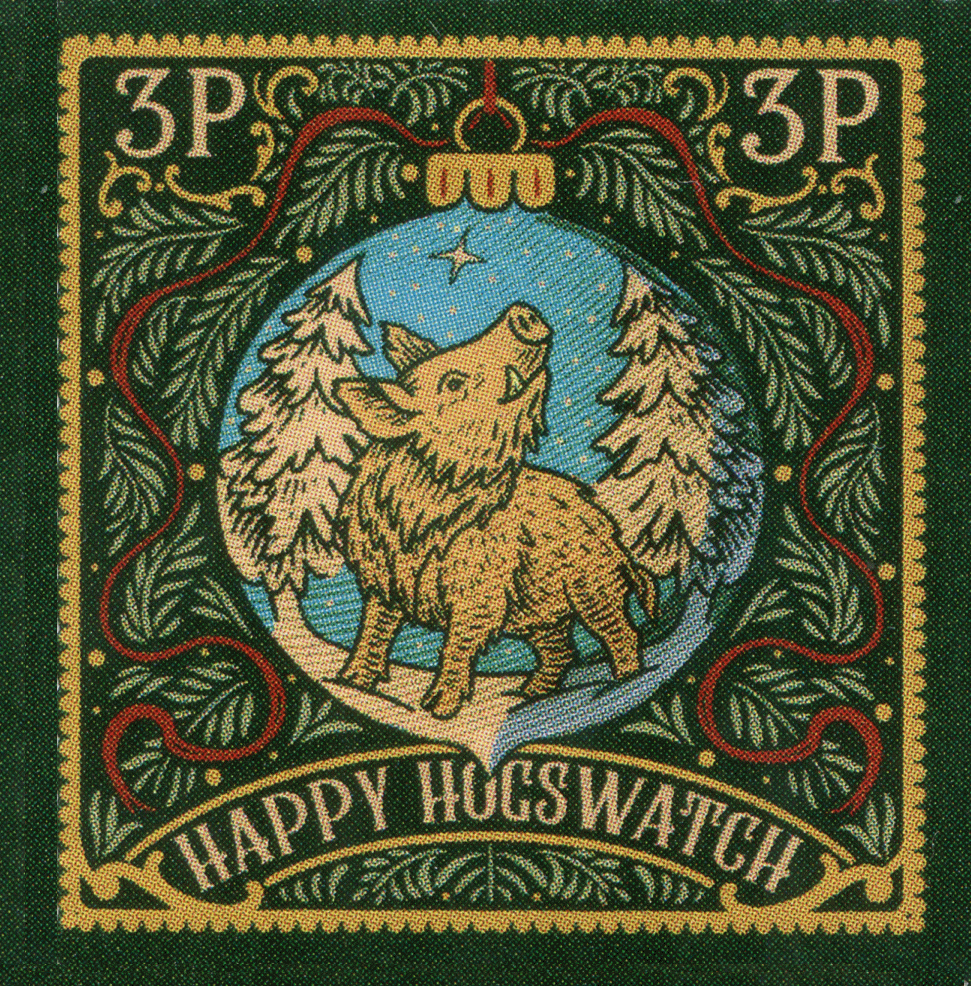 Gold, red and light green hues on forest green fir tree field 3P canton and canton sinister bauble with red ribbon HAPPY HOGSWATCH gold arched base