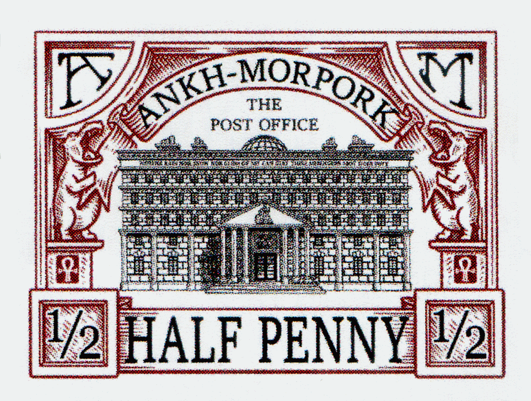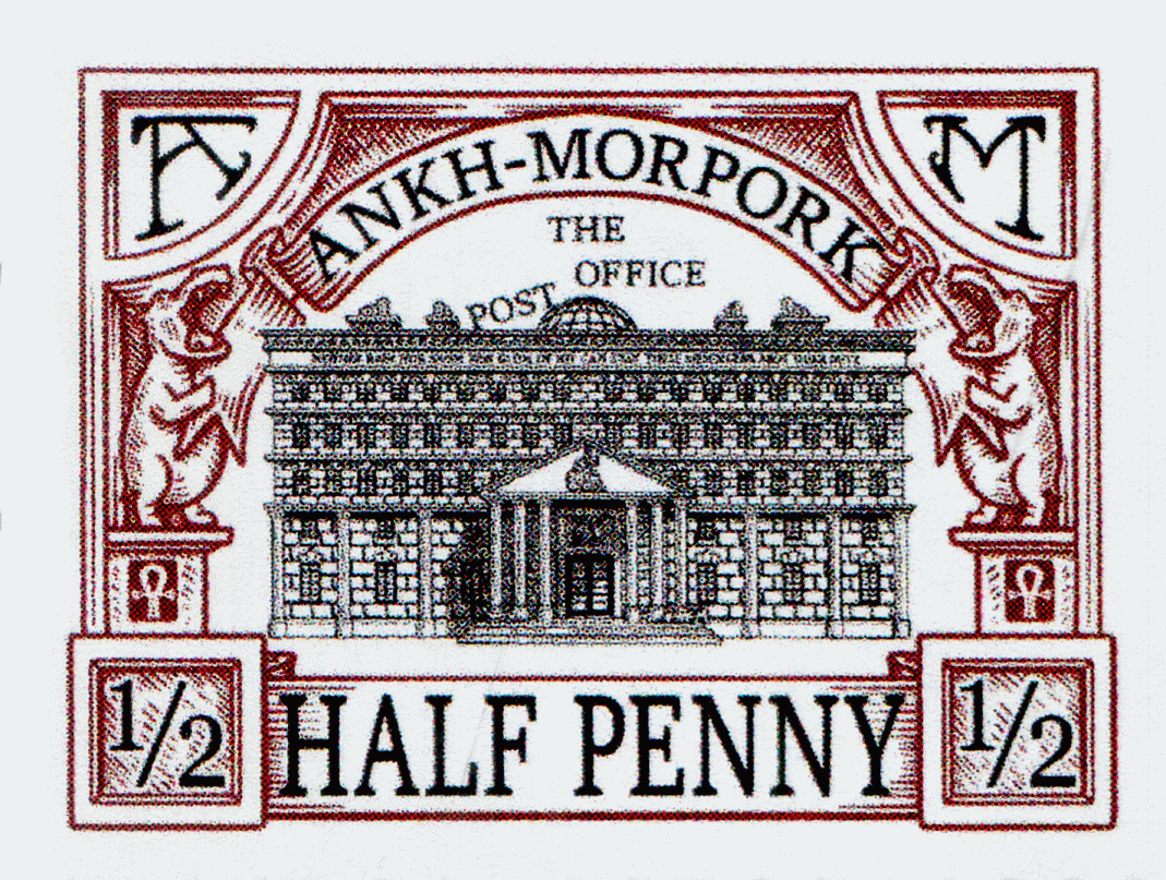 Burgundy on white field image of Ankh-Morpork Post Office in black with THE POST OFFICE over dome top framed banner ANKH-MORPORK above bordered by A dexter M sinister supported by hippos and Ankh HALF PENNY bordered by ½ dexter and sinister base