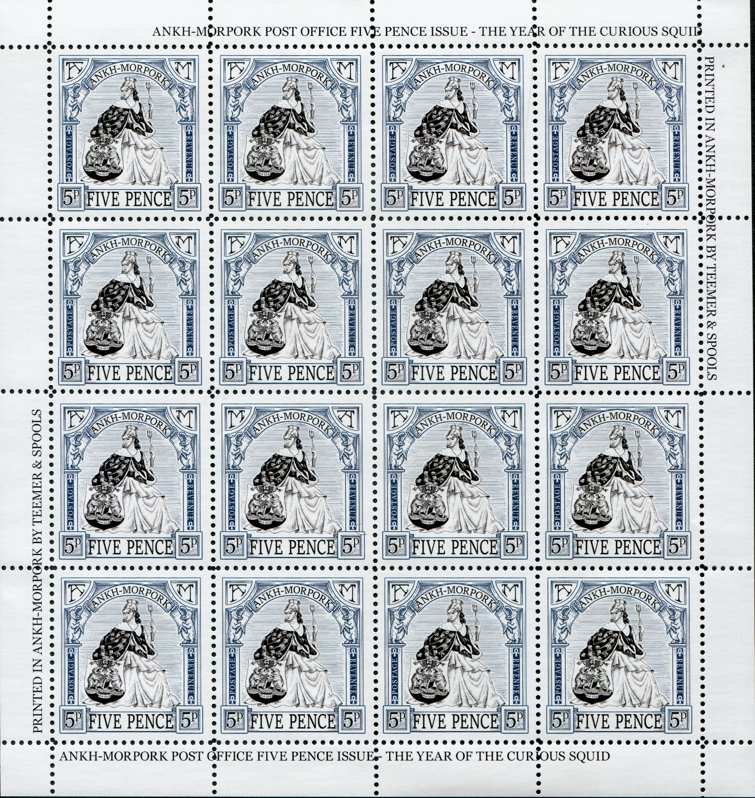 Slate grey and black on white field Morpork black ANKH-MORPORK banner bordered by A dexter and M sinister in Accouché shield supported by hippos and Ankh FIVE PENCE boarded by 5p in square base.