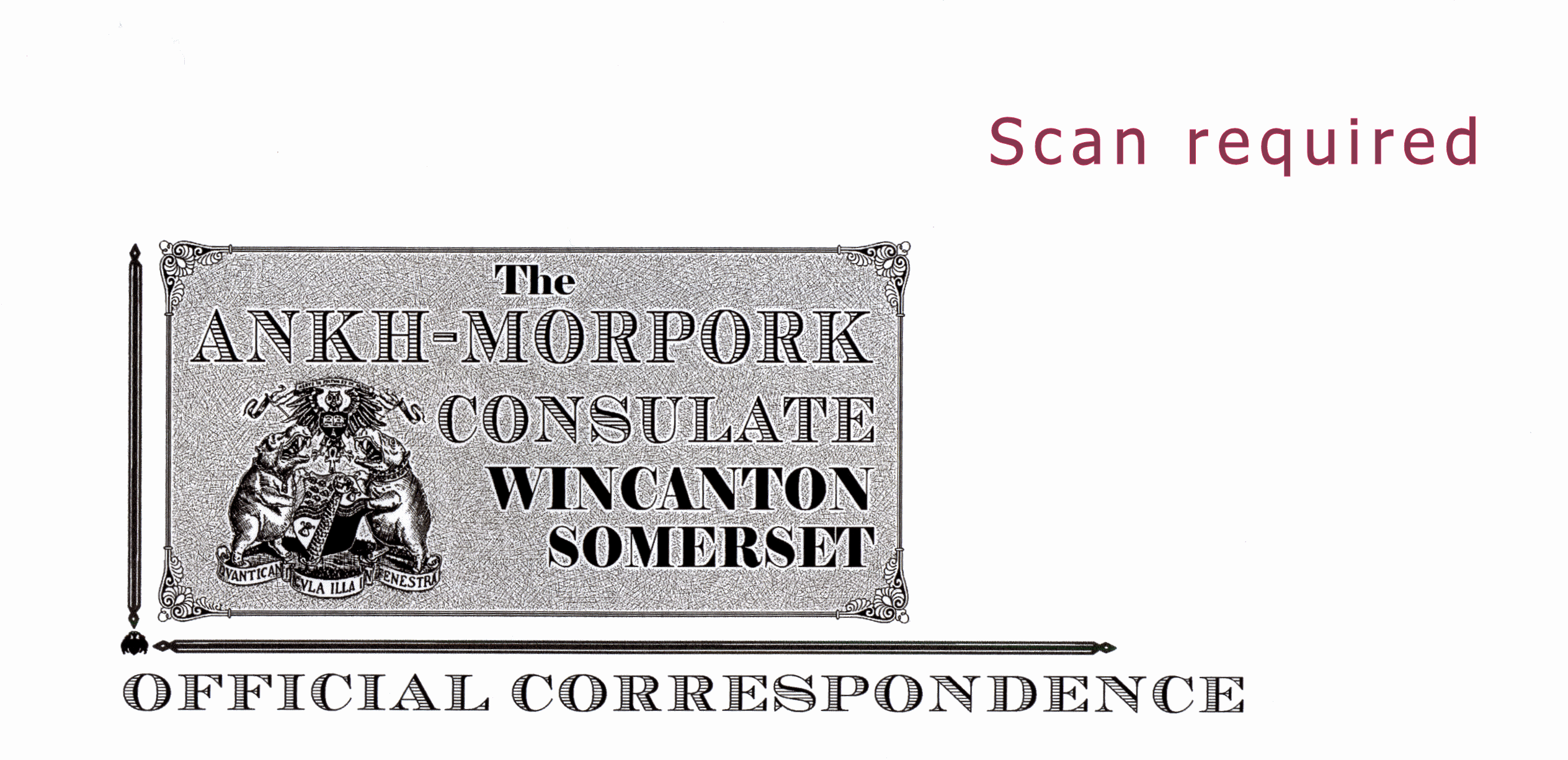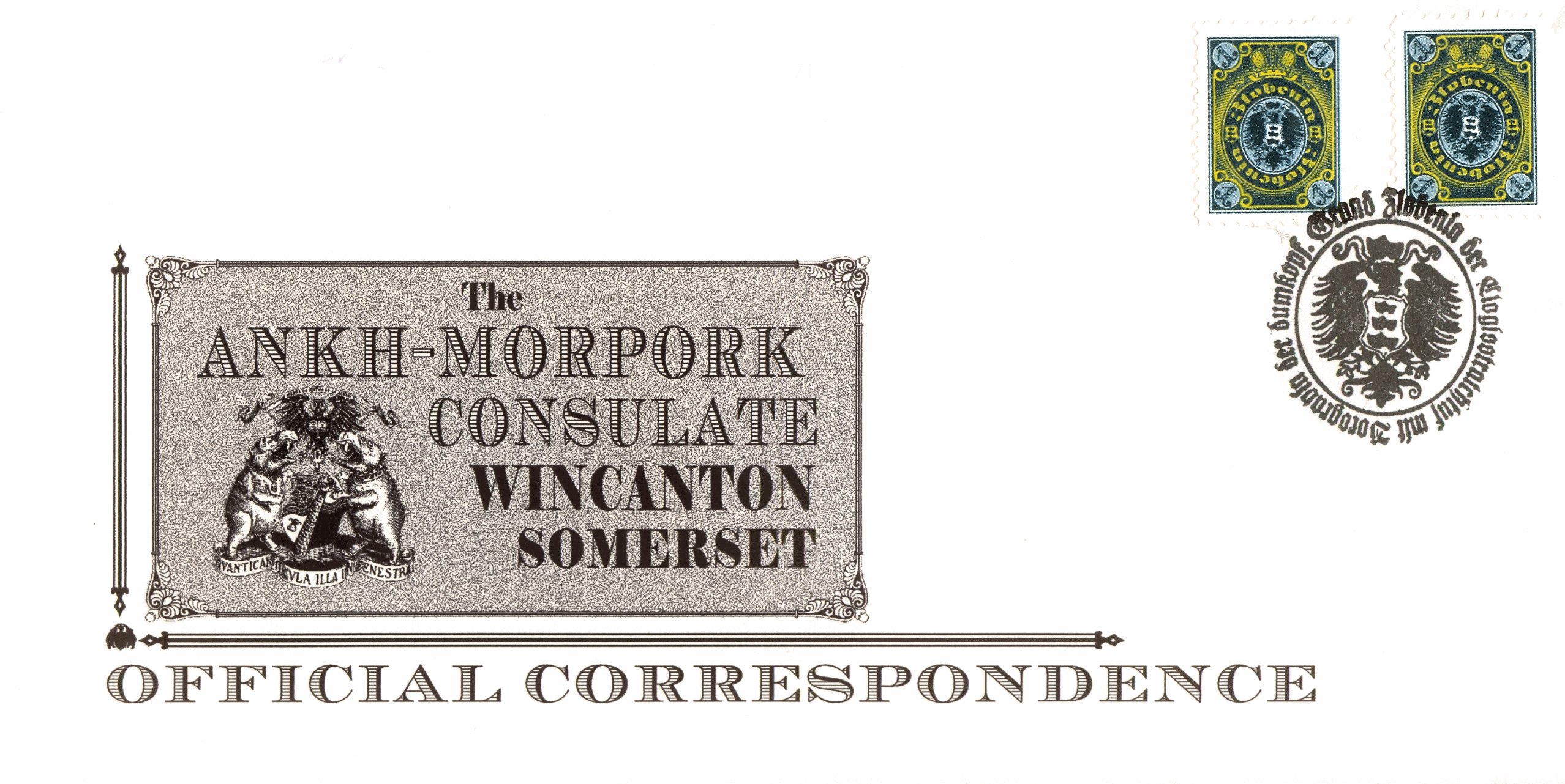 Cover DescriptionThe Ankh-Morpork Consulate Official Correspondence cover with a two 1 Zloty stamps and cancelled with a Grand Zlobenian frank.