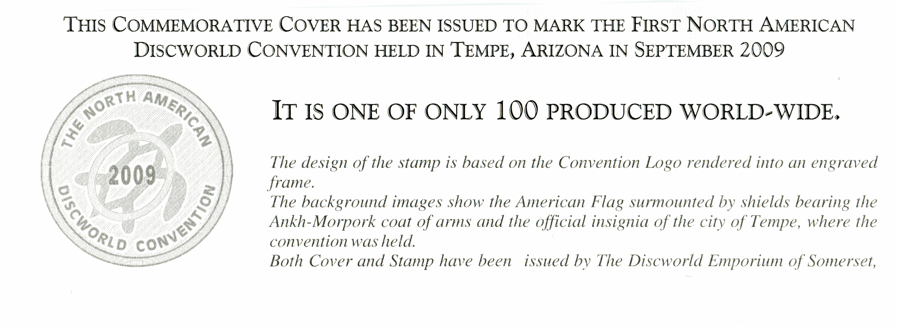 Cream envelope with the North American Discworld Convention logo in reds and the wording "TEMPE, ARIZONA, USA, SEPTEMBER 4-7, 2009" and the Ankh-Morpork Coat-of-Arms bearing the DWCW Con stamp and cancelled with the Convention frank in purple.