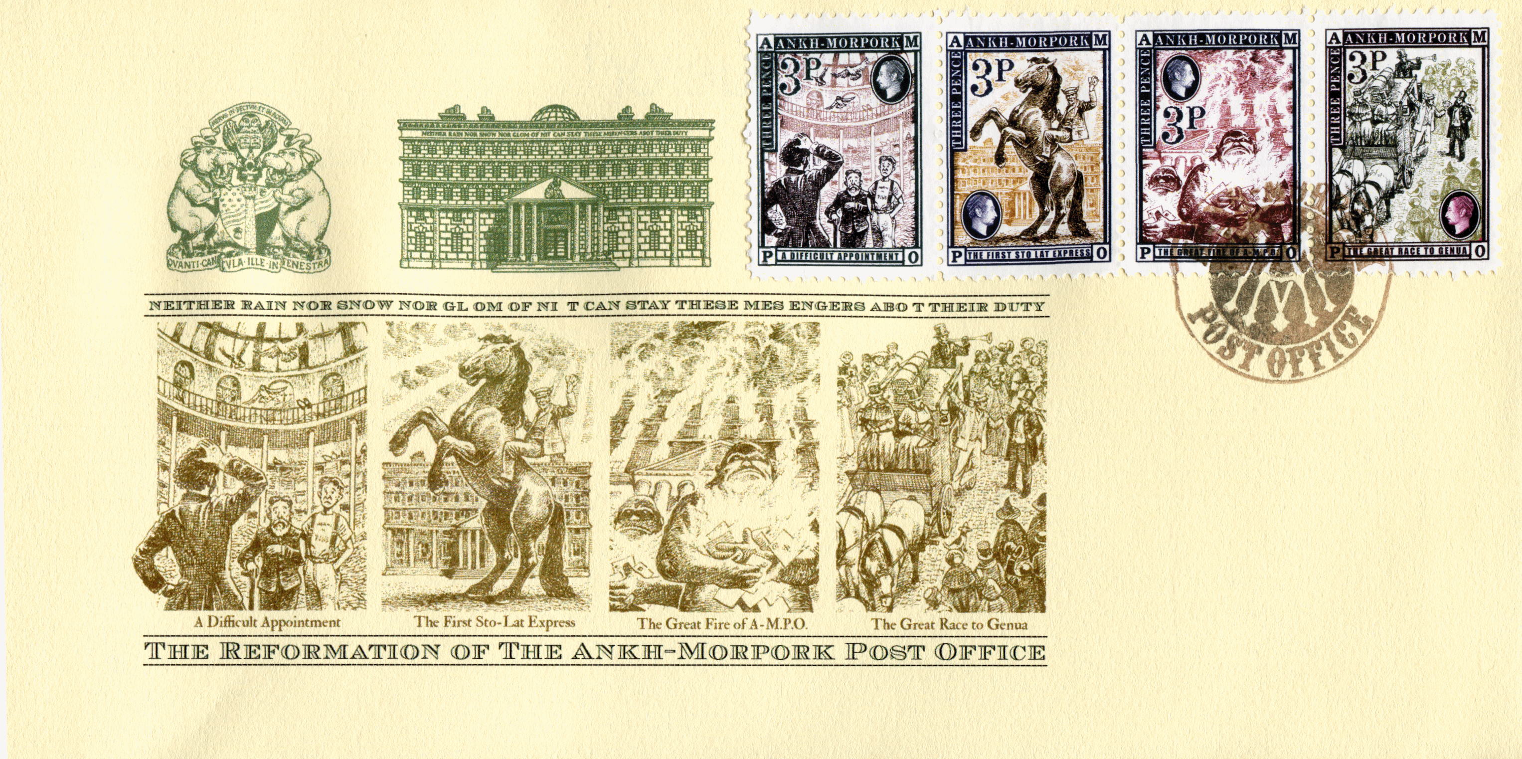 Top left the Ankh-Morpork Coat of Arms and an mage of the reformed Post Office above line draw images of four scenes from Going Postal and featured on the four 3p Post Office stamps with the wording THE REFORMATION OF THE ANKH-MORPORK POST OFFICE. Cover bears the four stamps and cancelled with the Ankh-Morpork Post Office counter frank.