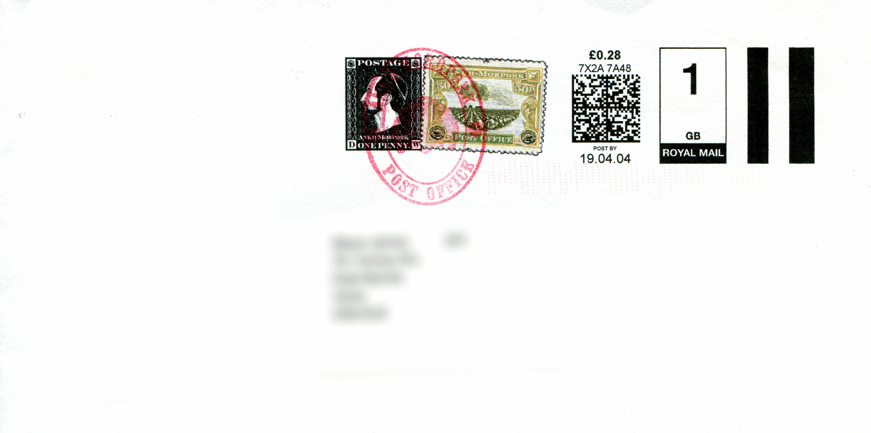 Cover DescriptionEnvelope with a facsimile of Discworld stamps and a printed Royal Mail postal label dated 19 February 2004.