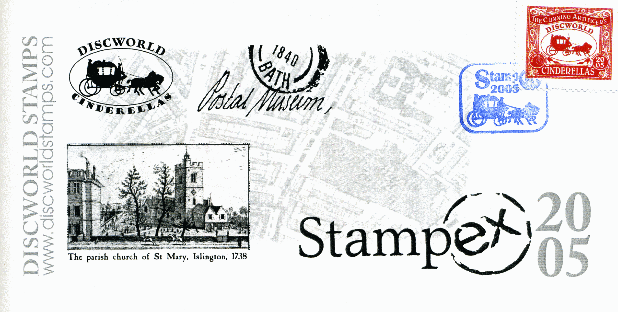 Shades of Green on White DISCWORLD over Oval frame with Coach and Horses Dark Green on White Central Scroll THE CUNNING ARTIFICER White on Dark Green top SG in Circular Frame White on Green Dexter 2005 in Circular Frame White on Green Sinister CINDERELLAS White on Green Bottom