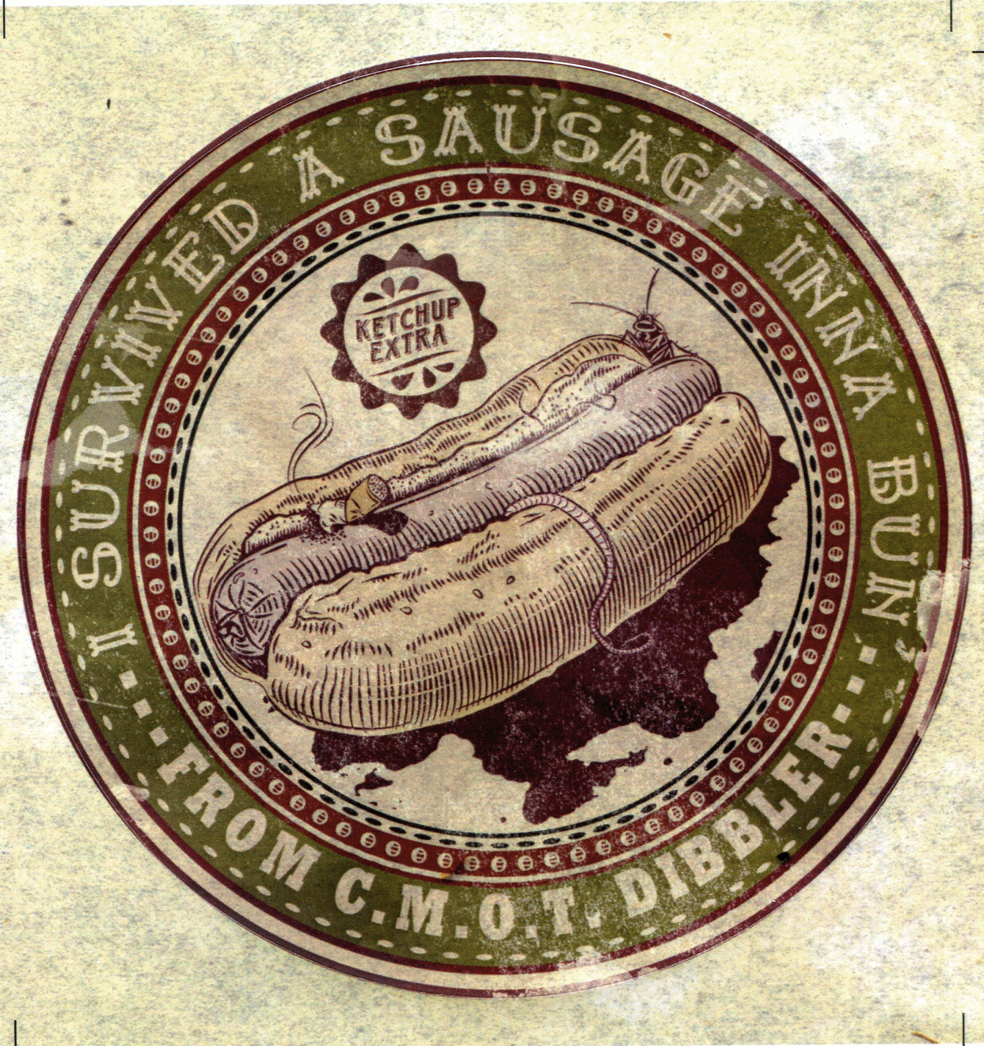 Circular sticker with a drawing of a C.M.O.T. Dibbler gormet sausage with motto KETCHUP EXTRA wit the wording I SURVIVED A SAUSGAE INNA BUN - FROM C.M.O.T. DIBBLER