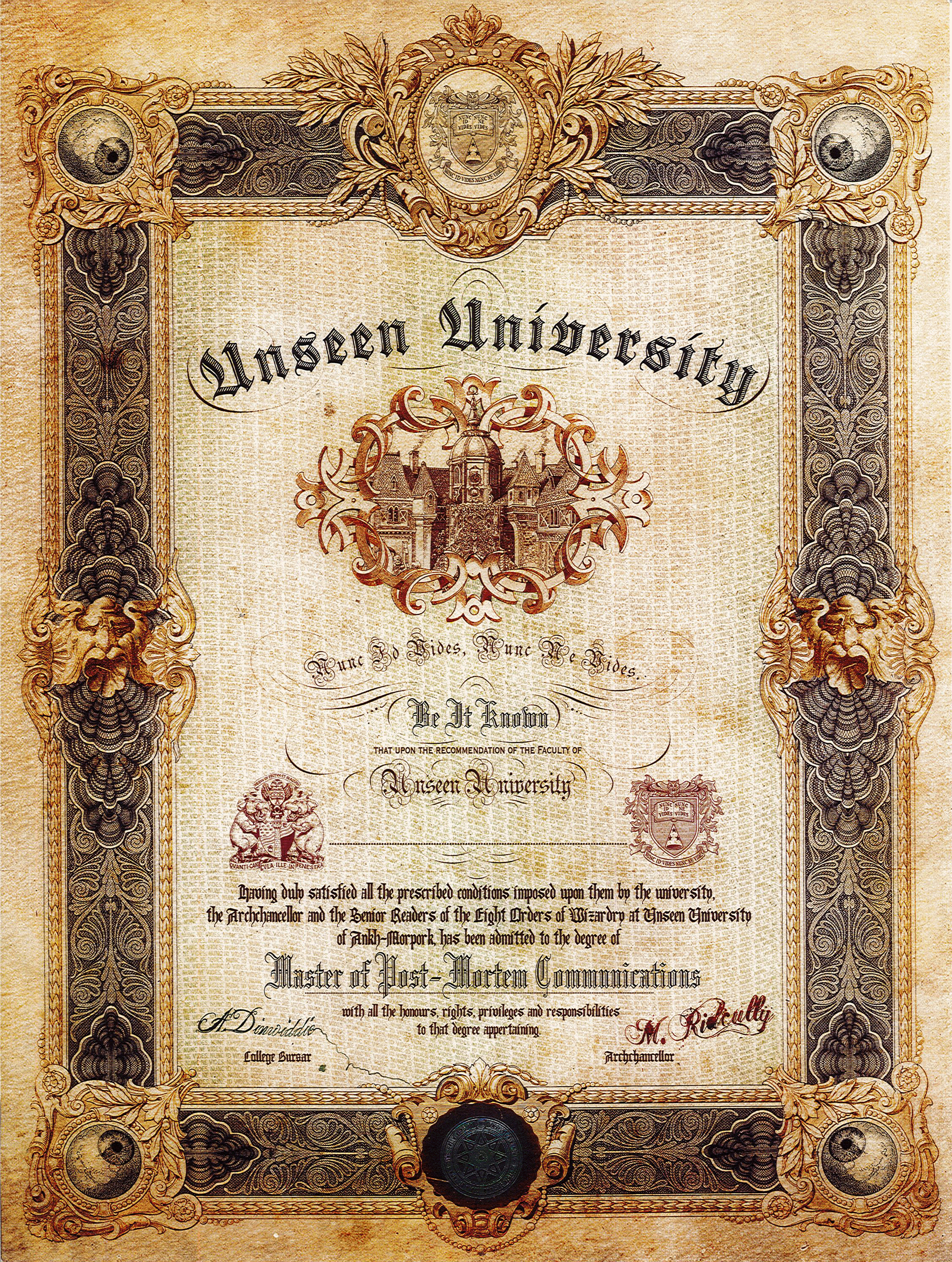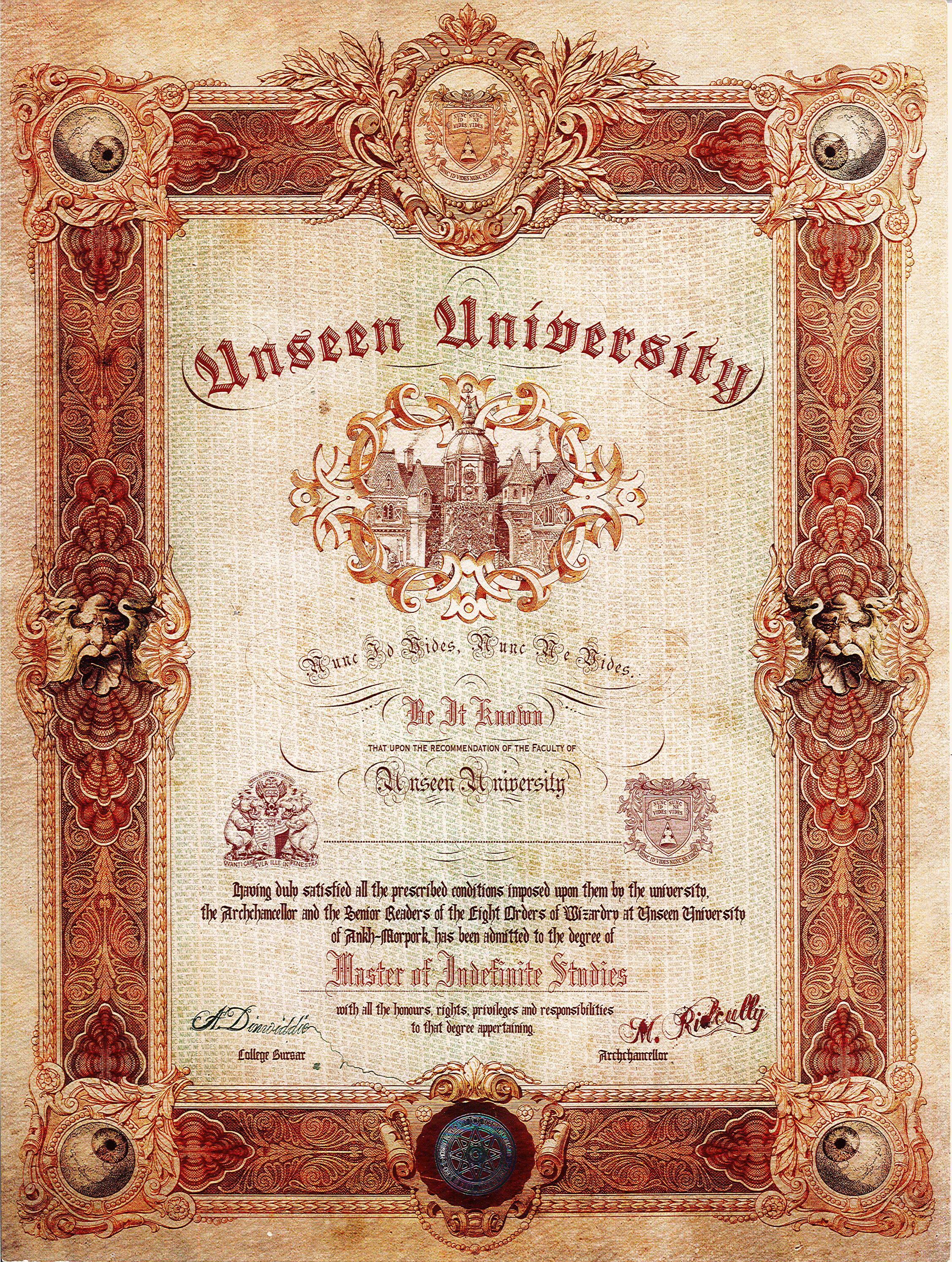 Having duly satisfied all the prescribed conditions imposed upon them by the university, the Archchancellor and the Senior Readers of the Eight Orders of Wizardry at Unseen University of Ankh-Morpork, has been admitted to the degree of