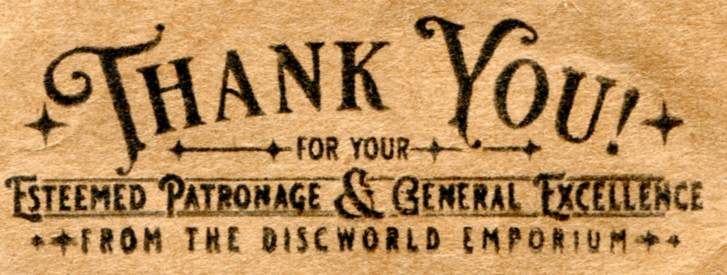 Frank DescriptionThank you for yourEsteemed Patronage & General ExcellenceFROM THE DISCWORLD EMPORIUMin black