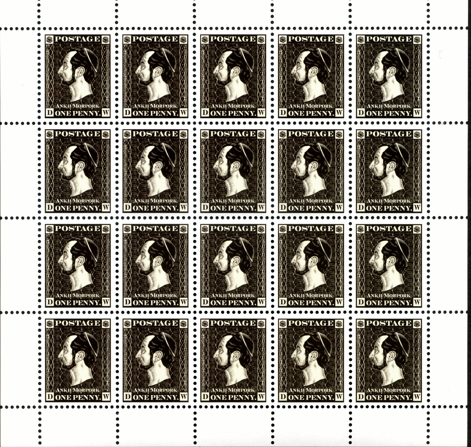 Large format sheet unperforated portrait quartered registration marks black registration bar below Engraved and Printed by Spools of Ankh-Morpork, 12 Dimwell Street ascending top right