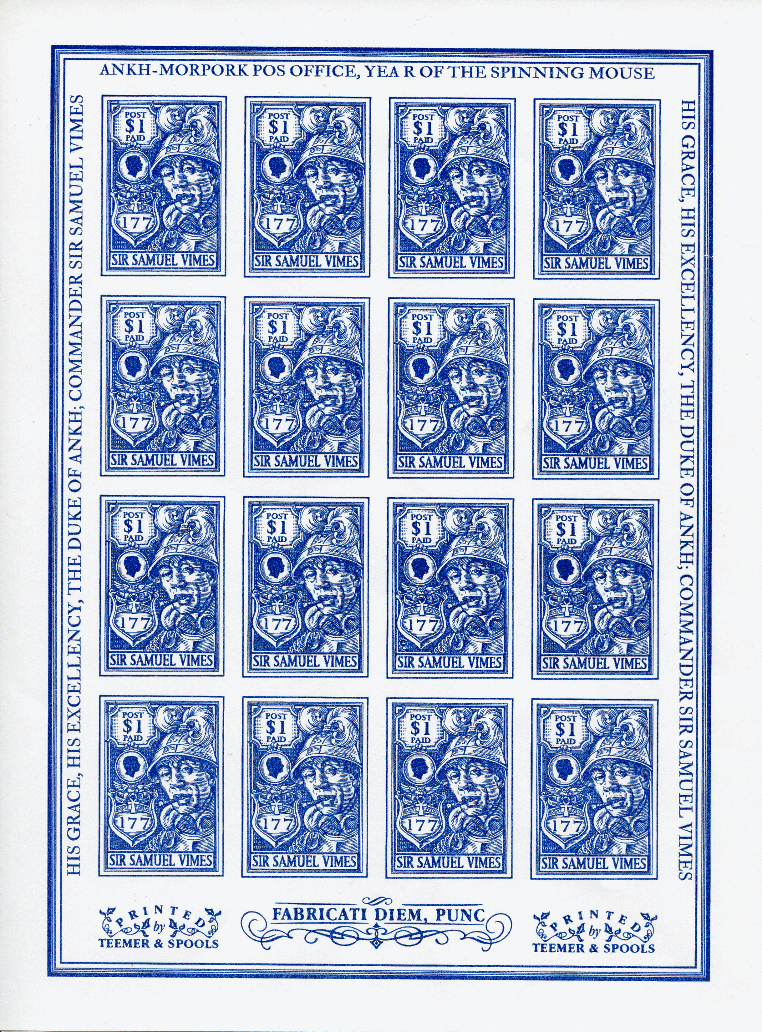Portrait Orientation Double Framed ANKH-MORPORK POST OFFICE, YEAR OF THE SPINNING MOUSE Top HIS GRACE, HIS EXCELLENCE, THE DUKE OF ANKH-MORPORK; COMMANDER SIR SAMUEL VIMES Left Ascending Right Descending FABRICATI DIEM, PUNC bordered by Printed by Teemer and Spools
