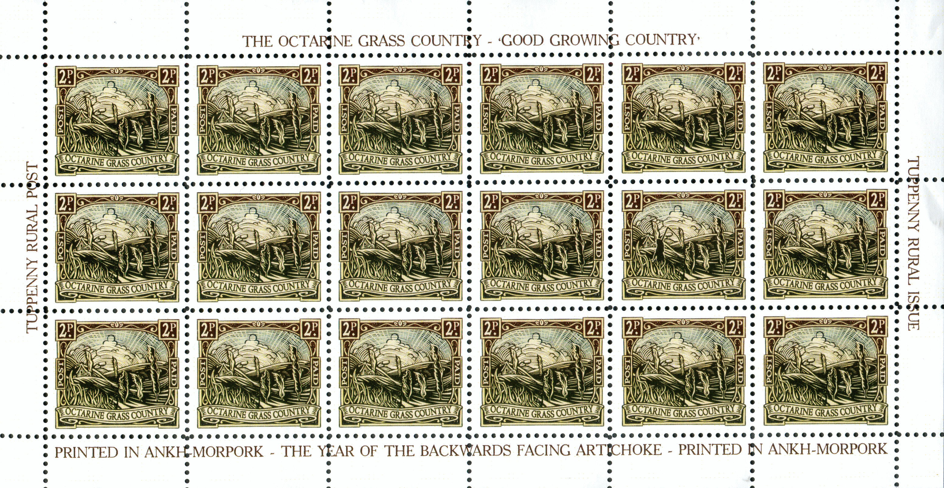 Landscape orientation no frame THE OCTARINE GRASS COUNTRY - GOOD GROWING COUNTRY top PRINTED IN ANKH-MORPORK - THE YEAR OF THE BACKWARD FACING ARTICHOKE - PRINTED IN ANKH-MORPORK bottom TUPPENNY RURAL POST left ascending right descending