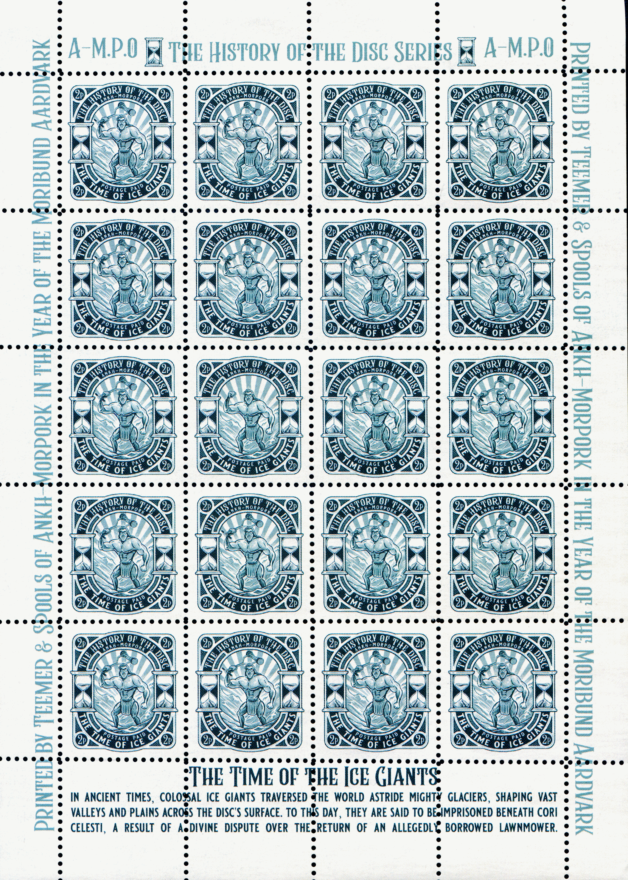 Portrait orientation THE HISTORY OF THE DISC SERIES bordered by A-M.P.O. with hour glass top PRINTED BY TEEMER & SPOOLS OF ANKH-MORPORK IN THE YEAR OF THE MORIBUND AARDVARK left ascending and right descending THE TIME OF THE ICE GIANTS bottom with description