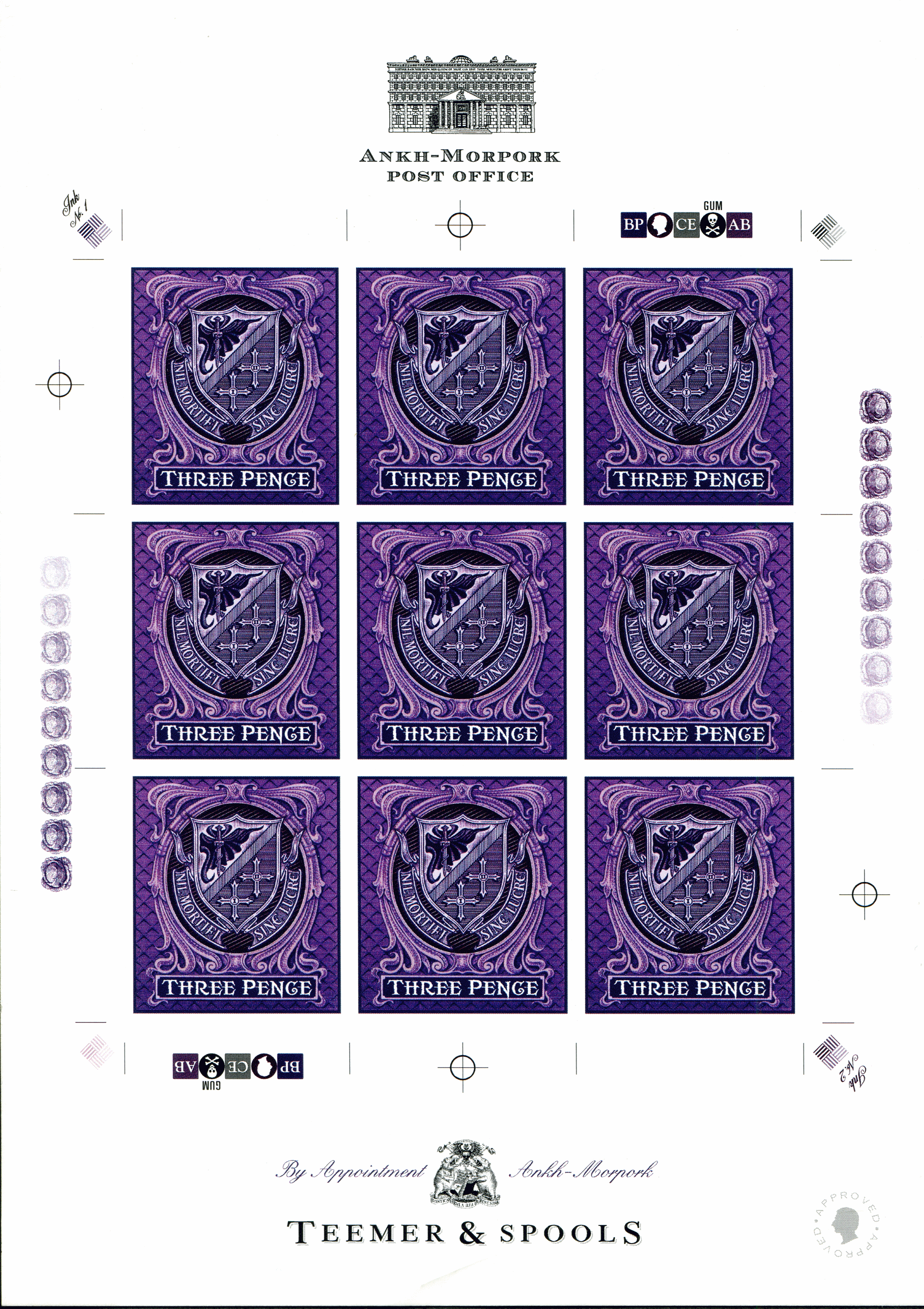 Portrait orientation Post Office image ANKH-MORPORK top 9 Assassin’s Guild Three Pence stamps squared Cartouche comprising 5 symbols BP Patrician CE Skull and Crossbones Gum AB top right bottom left Graduated Cabbages Purple left and right Ankh-Morpork Coat of Arms By Appointment Ankh-Morpork TEEMER & SPOOLS bottom