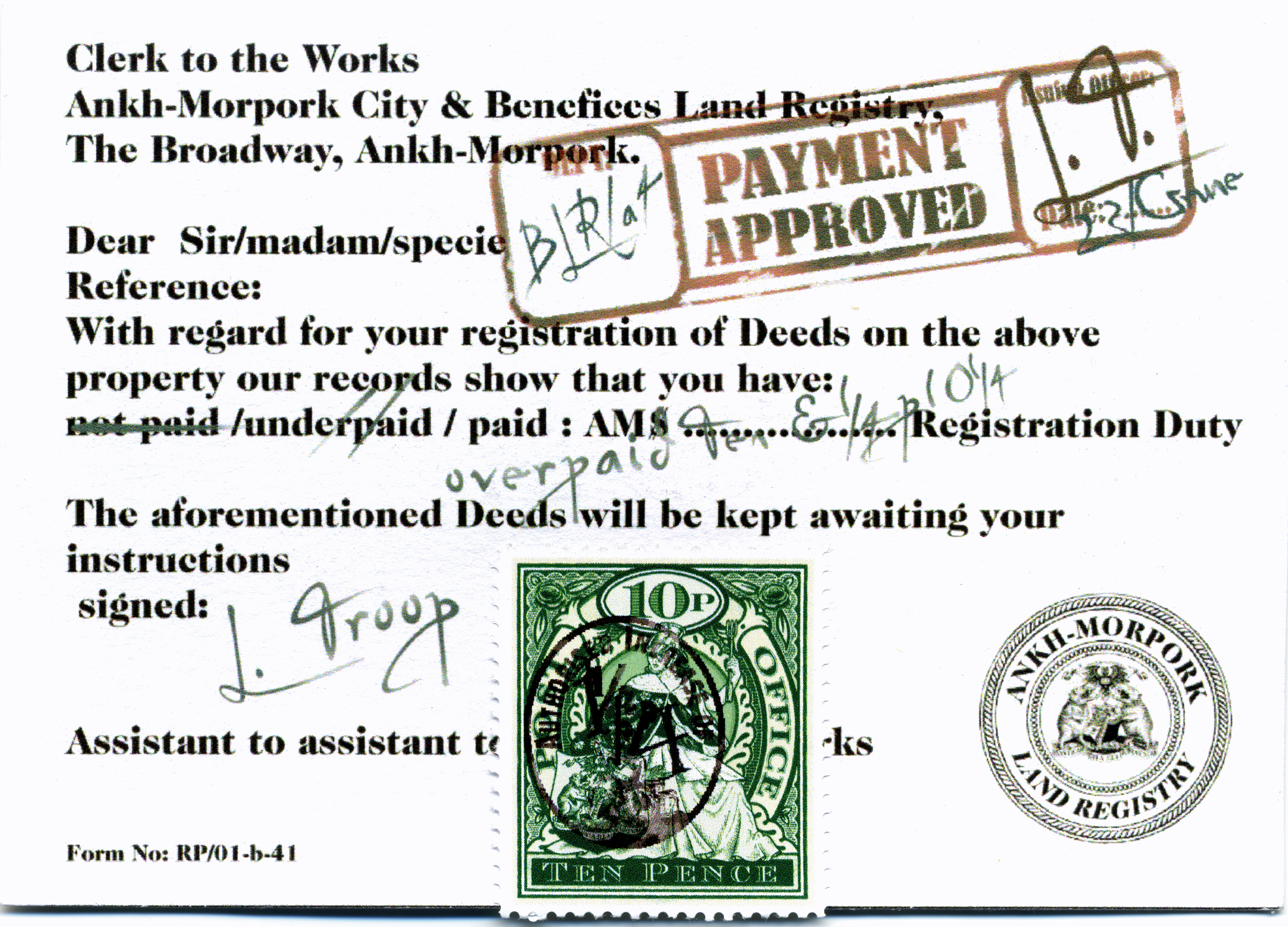 Tints of Green on White Morporkia Seated holding Ankh-Morpork Coat of Arms Dexter and Fork in Ascent Sinister in Curved frame with 10P in Oval Frame Bordered by POST OFFICE Cabbage motif Canton and Canton Sinister Base TEN PENCE White on Green Field