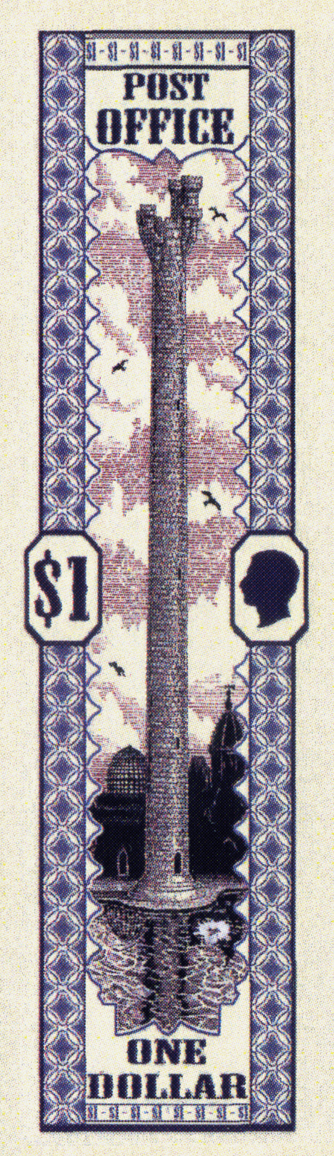 Gray and Postal Puce on Parchment Framed in Gray Patterning Tower Of Art on Puce Sky Bisecting the High Energy Building and the Main Hall and Reflecting Lake Two Birds Sinister and Two Birds Dexter Bordered by Columns Circle on Square Grey and Parchment with $1 Black in Octagonal Frame Midpoint Dexter and Patrician Profile Black Dexter in Octagonal Frame Midpoint Sinister Chief POST OFFICE Black Base ONE DOLLAR Black.