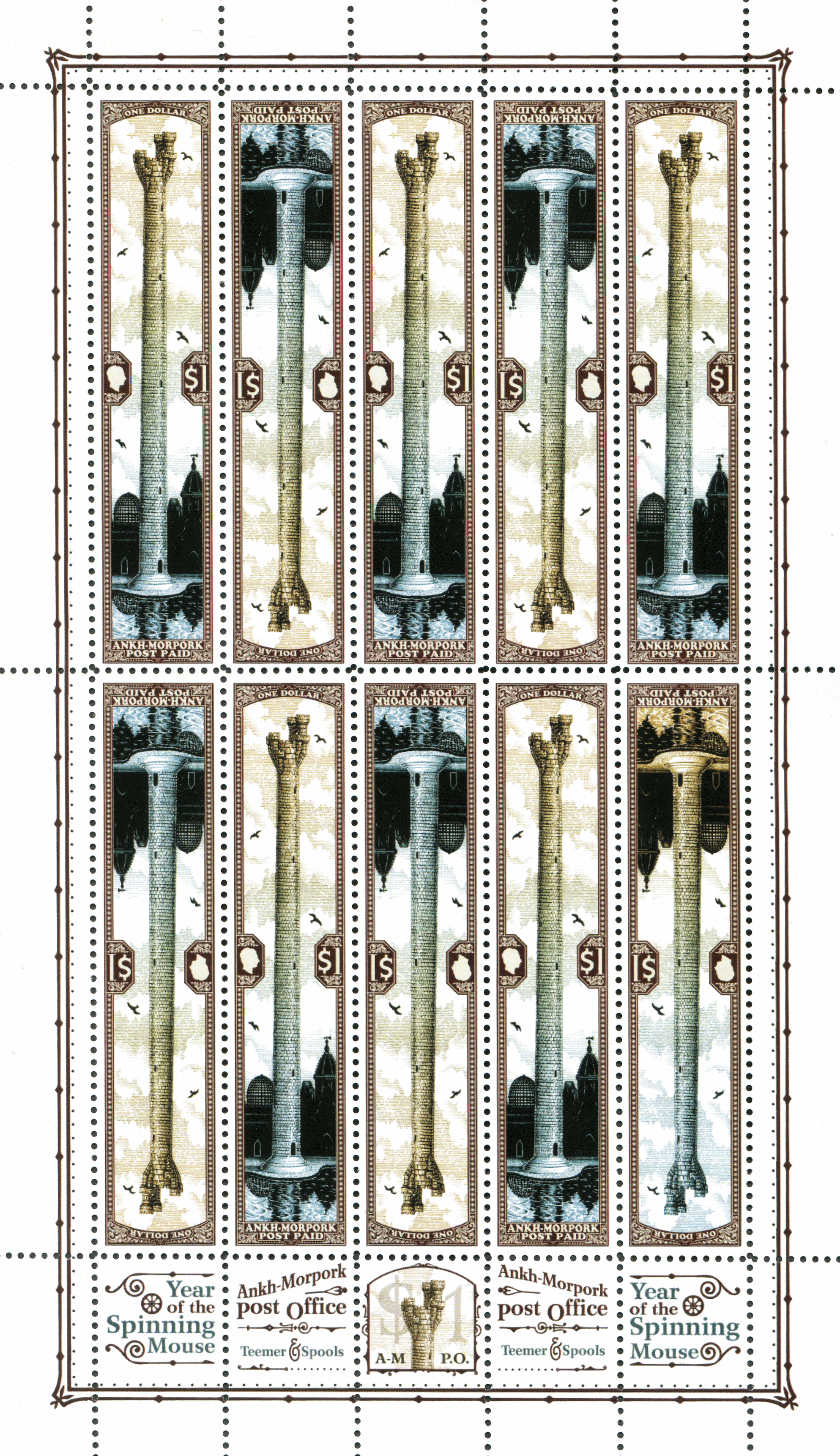 Burgandy on White Field Tower of Art on Beige Sky Bisecting the High Energy Building and the Main Hall and Egg Blue Reflecting Lake Two Birds Sinister and Two Birds Dexter Brown Bordered by Dotted Columns Patrician Profile White on Burgandy semi-octagon Dexter $1 White on Burgandy semi-octagon Sinister ONE DOLLAR White on Burgandy Arched Chief ANKH-MORPORK POST PAID White on Burgandy Base