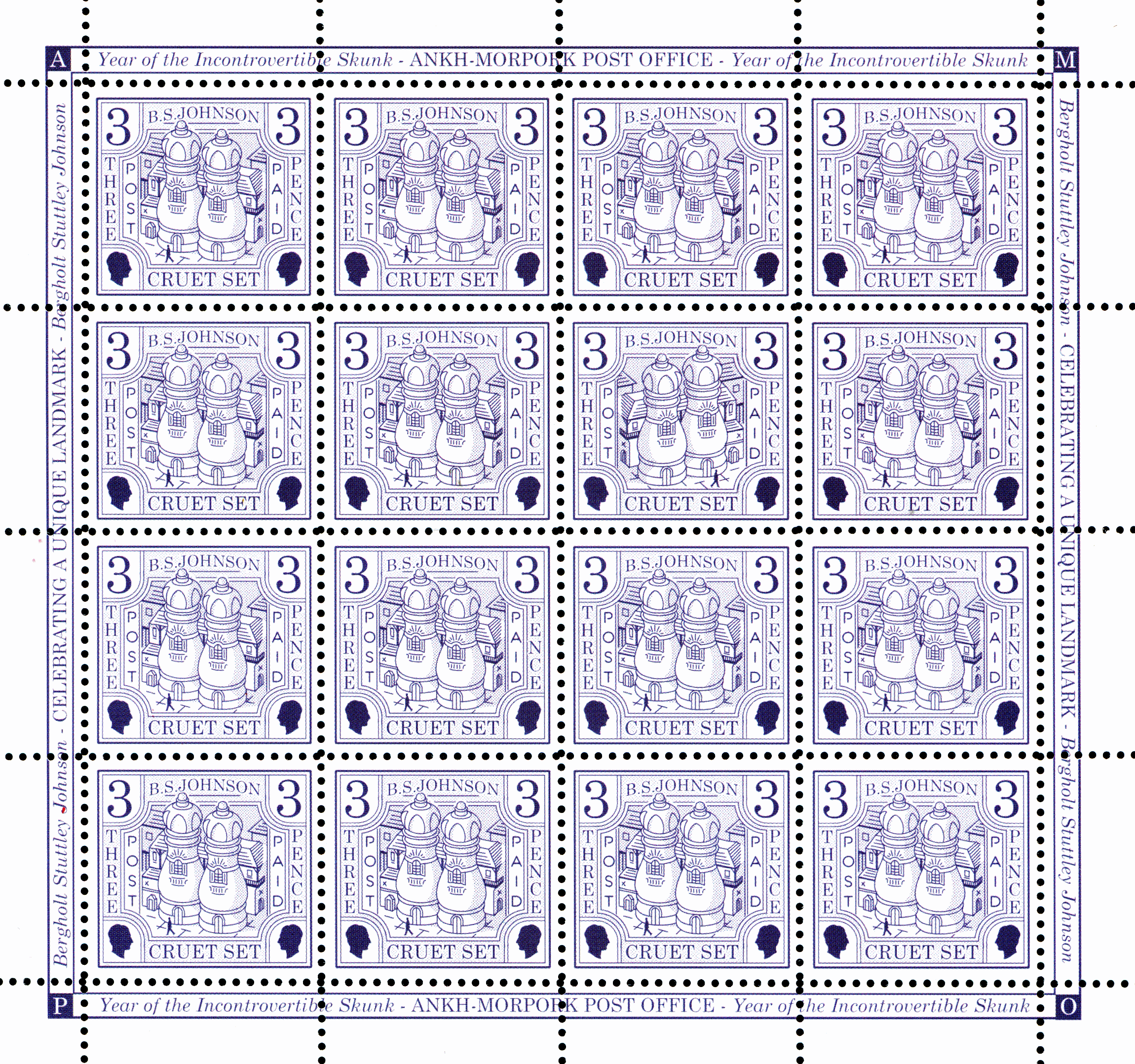 Purple on white filed 3 canton canton sinister B.S.JOHNSON chief cruet set building in scalloped frame THREE POST dexter PAID PENCE sinister CRUET SET base Patrician profile base dexter and sinister