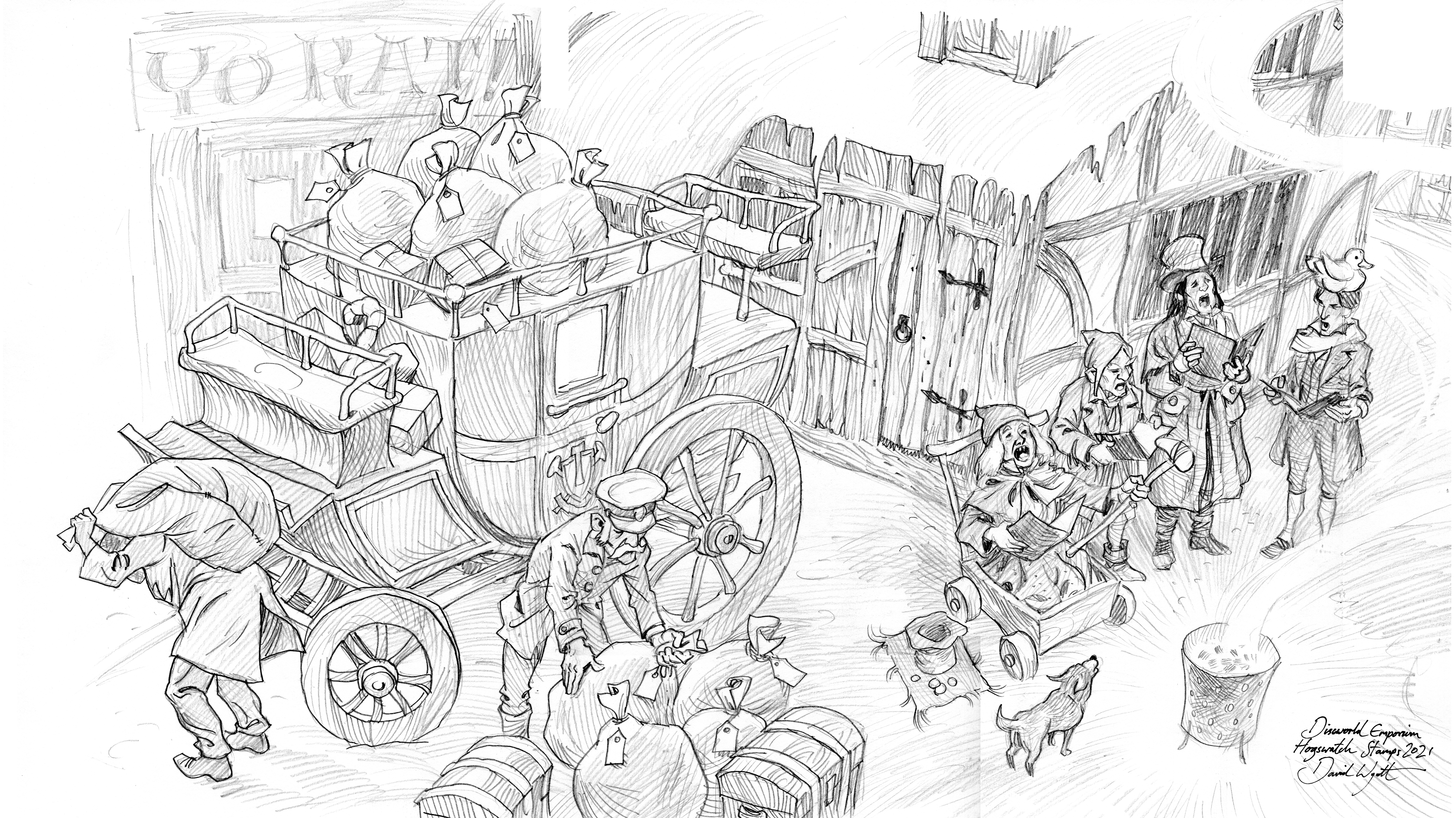 Coffee hues on white field scenes of Ankh-Morpork at Hogswatch
