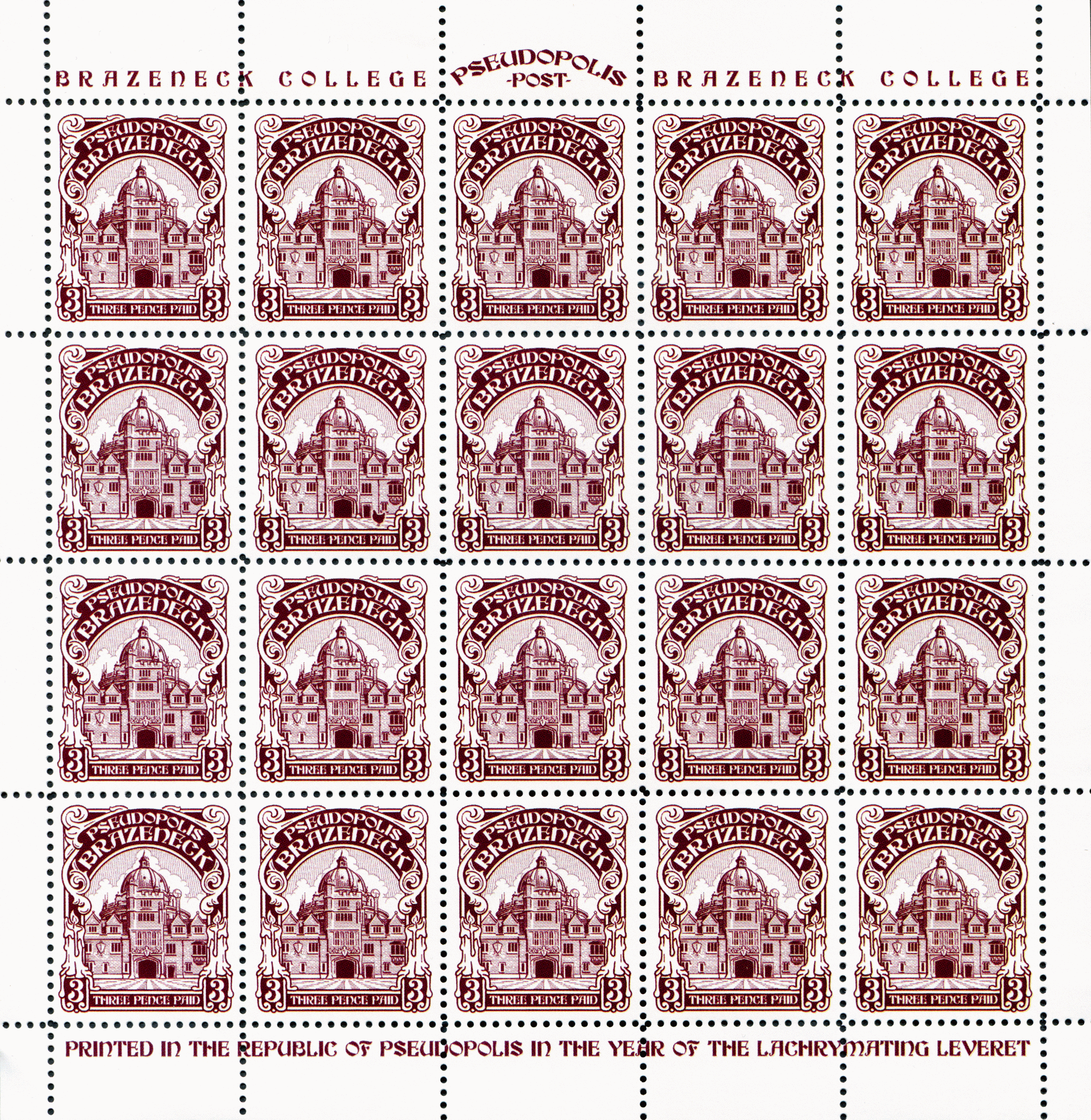 Burgundy on white main entrance to Brazeneck University enframed chief floral scroll motto ’PSEUDOPOLIS BRAZENECK’ white on burgundy lighted candles dexter and sinister ’THREE PENCE PAID’ bordered by 3 in shied dexter and sinister.