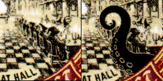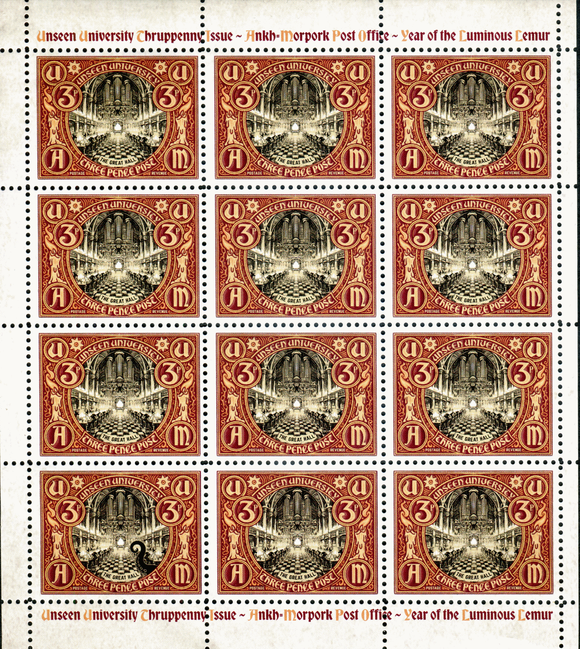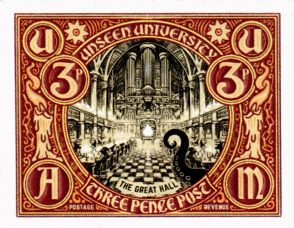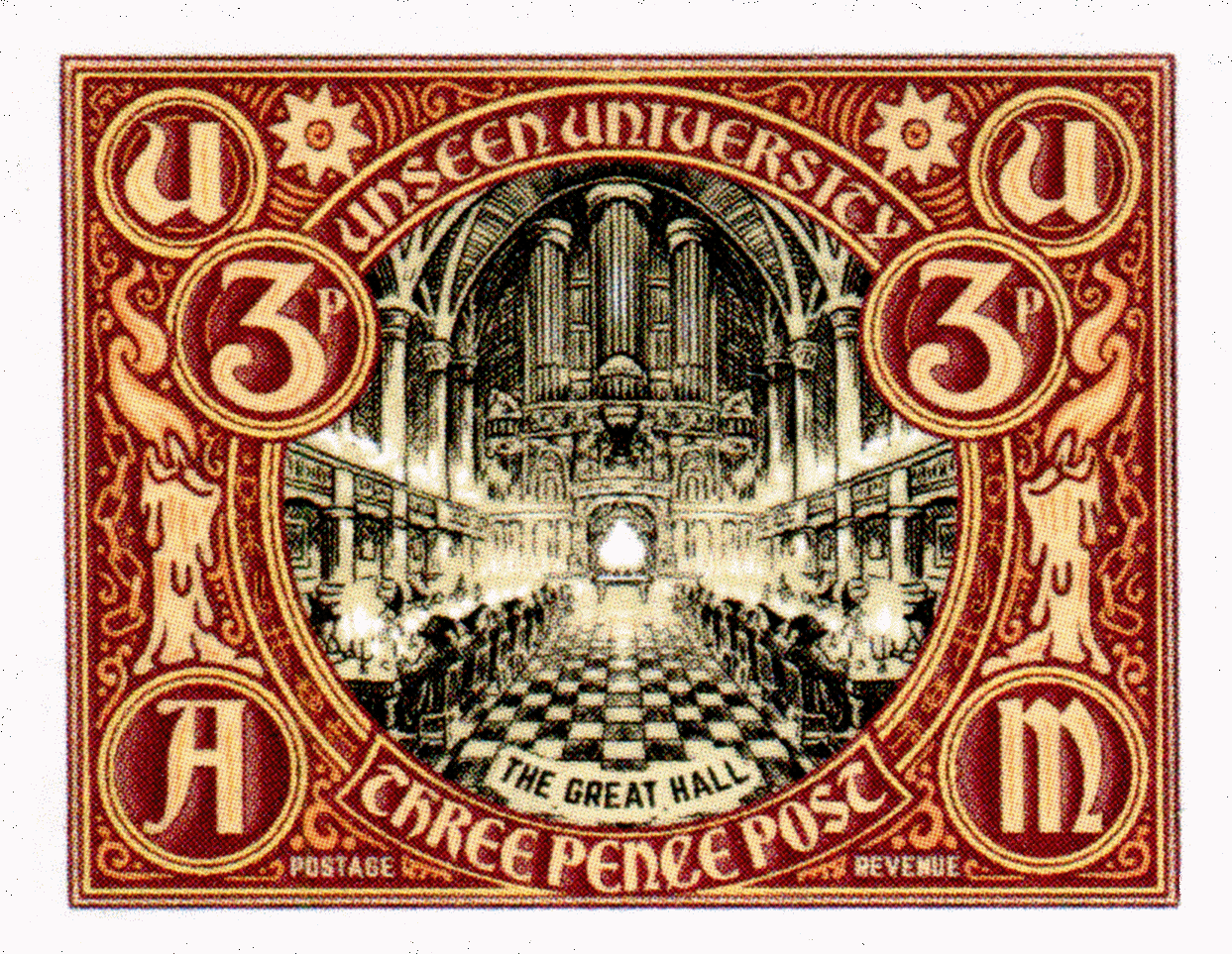 Orange hues on white field enframed U 3 canton and canton sinister The Great Hall with wizards dining UNSEEN UNIVERSITY top THREE PENCE POST bottom bordered by candles in roundel A dexter roundel M sinister