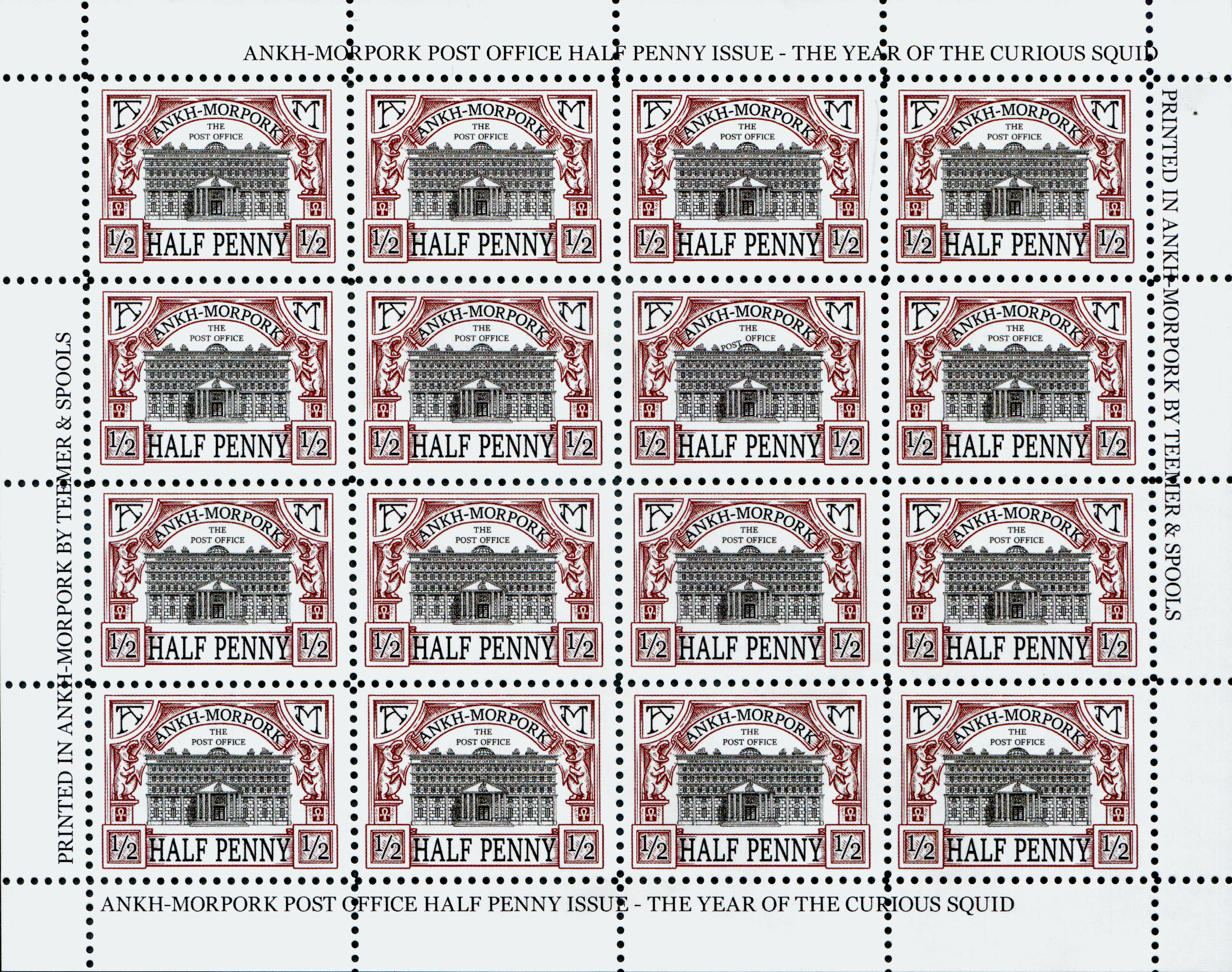 Burgundy on white field image of Ankh-Morpork Post Office in black with THE POST OFFICE over dome top framed banner ANKH-MORPORK above bordered by A dexter M sinister supported by hippos and Ankh HALF PENNY bordered by ½ dexter and sinister base