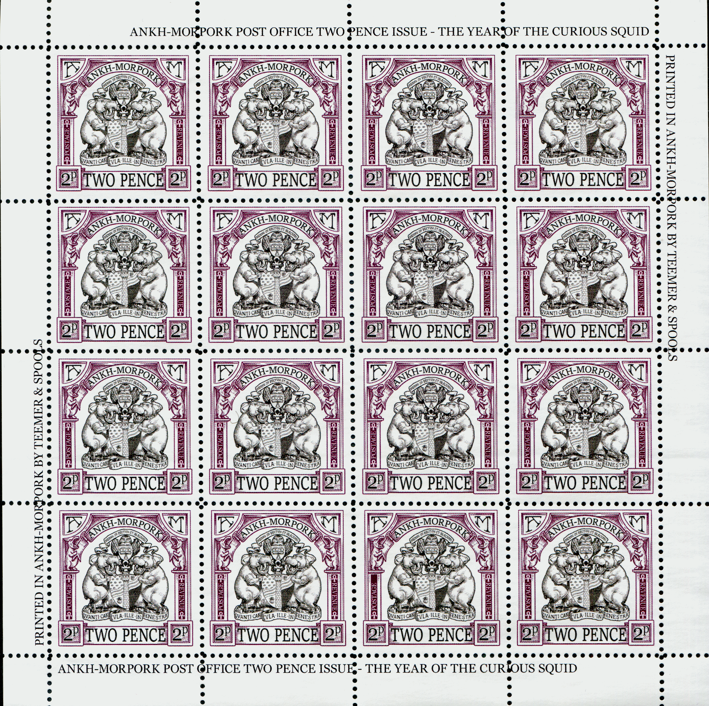 Burgundy and black on white field Ankh-Morpork coat of arms black ANKH-MORPORK banner bordered by A left and M right supported by hippos on columns ankh POSTAGE left ankh REVENUE right TWO PENCE boarded by 2p base.